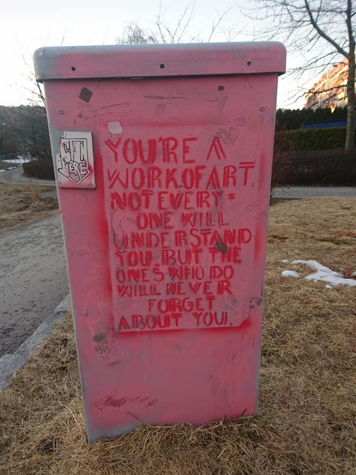Jeg tok en tur ut i dag. Hvor jeg var og hva jeg har gjort er ikke så viktig. Men jeg ble møtt av dette synet, da jeg ankom bestemmelsesstedet. På facebook delte jeg disse bildene, og skrev at Pappaen min hadde lagt igjen en liten beskjed, ment for mine øyne. Dere må gjerne tenke jeg er gal som oppfatter teksten på den rosa boksen og anden som en beskjed fra Gud. Det plager meg ikke så veldig. Jeg har sluttet å plages av hva verden tenker, tror og mener om meg. Jeg personlig vet dette var beskjeder fra Gud.