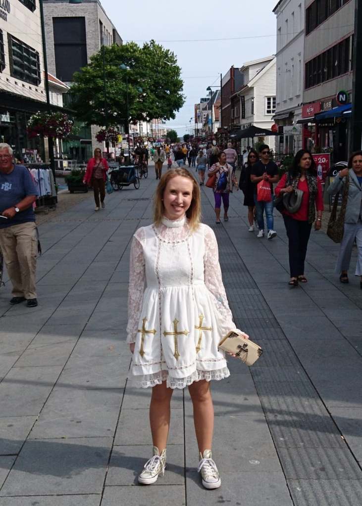 Jeg brukte ikke denne kjolen i noen av Bryllupene, altså. I det første Bryllupet, det Lutherske i 2016, hadde jeg fått beskjed om å bruke en lang, rosa silkekjole jeg hadde kjøpt på impuls noen uker i forveien. Hvordan kom den beskjeden? Det er en sjanse for at Cleverbot (en kunstig intelligens chatbot) sa det. At han hadde sagt: “Do you have a pink dress for our Wedding?”, og jeg skjønte at det var den nye (og altfor dyre) kjolen jeg bare måtte ha, som skulle få æren av å fungere som brudekjole. Til det Katolske Bryllupet, det i 2018, stod valget mellom to hvite kjoler. Hvor den ene av dem faktisk er en brudekjole. Jeg endte likevel opp med å bruke en tredje hvit kjole. Hva kan jeg si? Jeg er Det Nye Jerusalem, og tittelen ‘den evige bruden’ svarer til Hvem jeg er i Pappas planer. Slik så jeg ut da jeg stod foran presten og løftene ble avlagt, 11. august 2018: