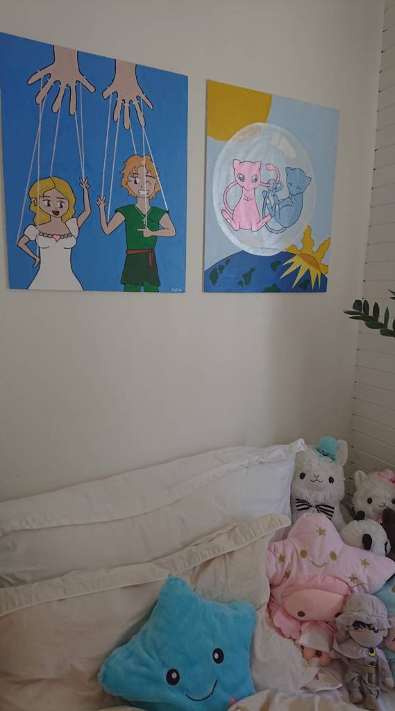 Bildet til høyre, av de to jeg har hengt opp, er det nyeste maleriet mitt. Dette forestiller min Bror og meg, i en verden med to soler på himmelen. Mamma forteller meg at dette har vært virkeligheten til dette solsystemet før, og at det kommer til å bli slik igjen. Når Jorden har to soler, sier det seg selv at det er mindre is på polene. Det er derfor det er mer vann på Jorden, og det som er av landmasser bare er øyer i det store havet. Dette maleriet ble forøvrig også påbegynt i 2016, men satt på vent etter at de to Pokémonene var malt. Grunnen til at jeg ikke fullførte det før nå, handler om at jeg måtte være sikker på Hvem den blå Mew’en skulle representere. Som jeg allerede har nevnt, så er det Broren min – han jeg kaller Kong JewZeus eller bare Joey. Det var også han den lille gutten på ryggen min, i drømmen jeg akkurat delte med dere, skulle representere. Og min vakre Tvillingbror og jeg er faktisk enige om at han er Peter Pan. Det er bare ikke noe Vi snakker så høyt om. Heldigvis er denne usagte enigheten som om den skulle vært tatovert i hjertet mitt. Og Vi trenger ikke snakke om det med stemmene Våre.
