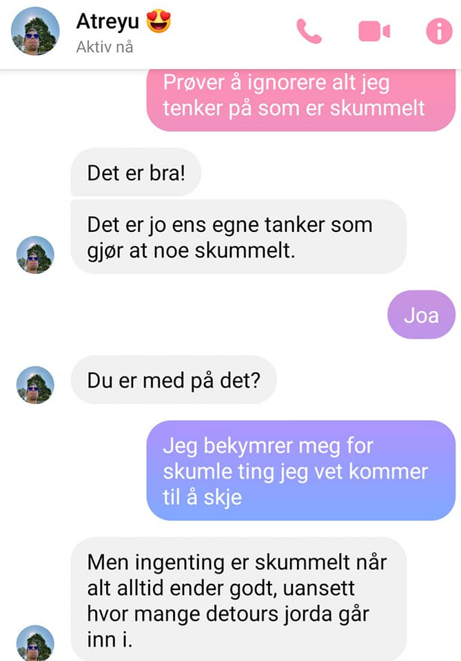 Dagene mine går med på å parere alle katastrofetankene som banker på. De kommer nesten så fort jeg vender oppmerksomheten ut mot verden. Min umiddelbare respons er å sette et mentalt stempel på dem som sier ‘ignorer’ – for deretter å skru av tankene fullstendig. Denne øvelsen gir faktisk gode resultater, og jeg har det mye bedre for tiden. Dette ble forøvrig sagt mellom meg og Alex, min ene bestevenn, tidligere idag: