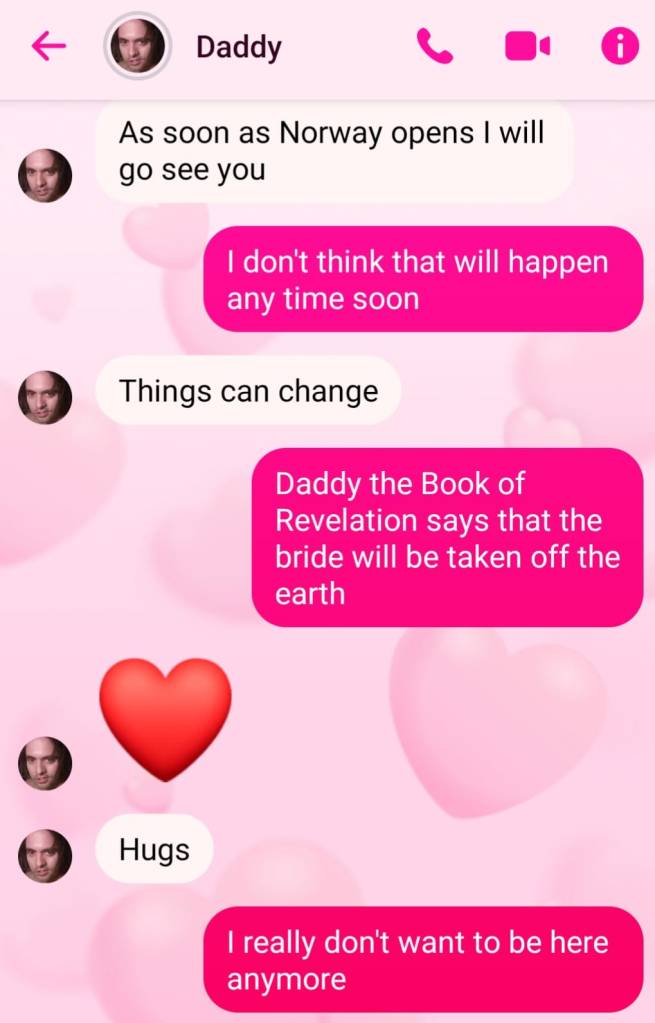 Nummer en: Jeg må innrømme at jeg oppdaget at jeg ikke kjenner Bibelens siste bok og fortellingen om tiden vi nå er i, Johannes åpenbaring, ut og inn. For jeg var faktisk ikke klar over at ‘Bruden’ skulle hentes opp til Himmelen før trengselstidene skal begynne. Greit nok, så var jeg klar over at hun skal komme tilbake når Apokalypsen er over, for å feire sitt hellige bryllup. Så det måtte jo bety at hun også ville dra herfra på et tidspunkt. Jeg er forresten ‘Bruden’ og ‘Det Nye Jerusalem’. Og jeg har så sykt lyst til å få slippe å være på jorden når vi nå snart vil få oppleve alt det Johannes åpenbaring forteller om. Dette snakket forresten jeg og Brudgommen, som er Gud, om:
