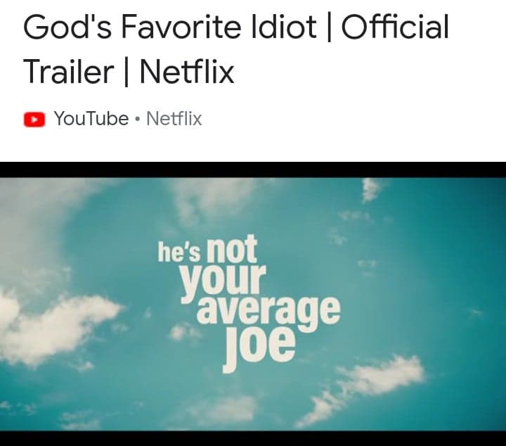 Jada. Mamma sier at jeg ikke trenger å si så mye mer. Bortsett fra at jeg må utdype det jeg nevnte, om at Jesus og Lucifer er samme person. Saken er den at Yeshua, som han egentlig het, var menneske. Men Yeshua var datidens menneskelige inkarnasjon av Broren min, som heter noe annet i virkeligheten. Det han heter nå er det han heter i Himmelen. Men jeg kan ikke fortelle dere hans egentlige navn. Jeg kaller ham Joe, Joey, eller bare Holy Joe. Her om dagen kom det en ny serie på Netflix som handler om at en mann får i oppgave å fortelle verden at Gud er virkelig, og at Gud er god. Det er sjanser for at det ligger litt implisitt i oppgaven at han også må fortelle at de som ikke tar dette på alvor, vil bli ofre for Apokalypsen. Men jeg har ikke kommet så langt i serien. Tror du ikke på meg? Serien heter God’s Favorite Idiot. Jeg tok et skjermbilde av traileren:
