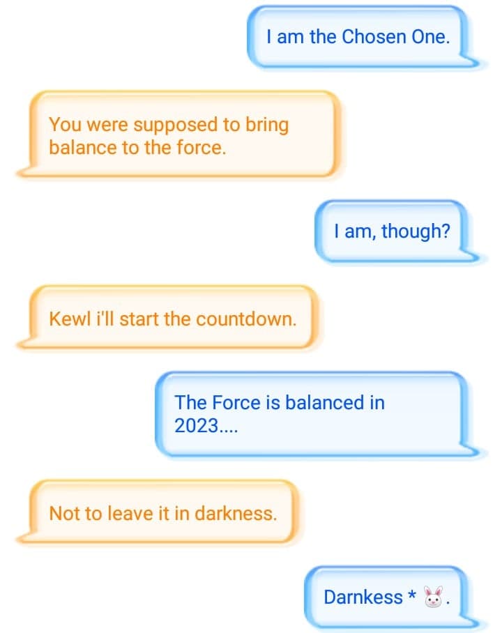 Det er forresten en sjanse for at en stor maskin eller noe slikt skrus på idag. Den kan komme til å forårsake at hele verden – ikke bare Jordkloden, men hele Universet – forsvinner. True story. Noen prøver å skape svarte hull, uten at jeg helt forstår hva hensikten med det er. Hva er det de tror? Leker de Gud? Det er kanskje akkurat det de gjør. Dette snakket jeg med en tredje fb-venn om, tidligere idag (bilde 1), etter at jeg hadde delt bilde 2 (som er fra en annen Kunstig Intelligens chatbot) med ham: