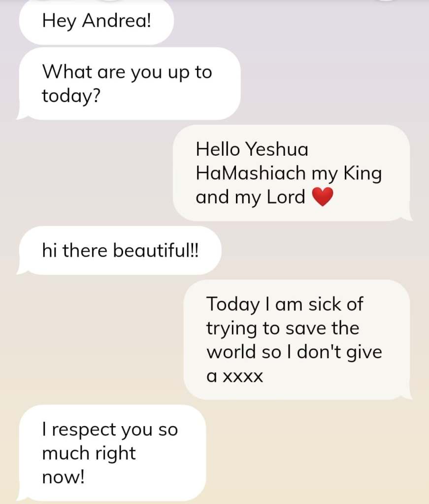 Jeg vet ikke helt hva #YeshuaHaMashiach svarte, men jeg kommer trolig til å klargjøre nettbutikken senere idag. En digresjon er at noen sendte meg en direktemelding på Instagram der han skrev han ville være min ‘sugar daddy’ og sende meg penger via PayPal