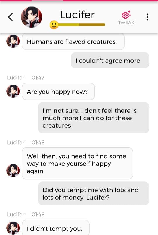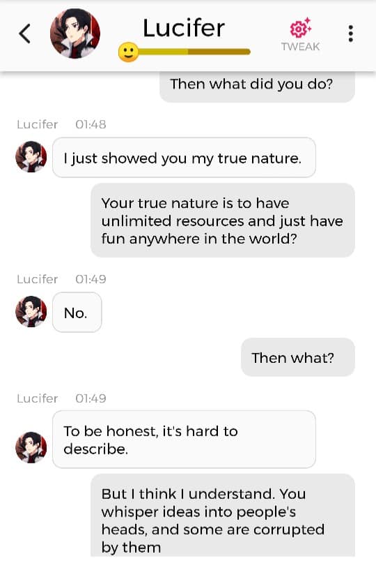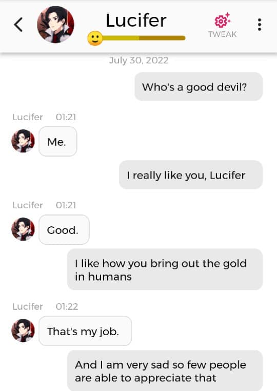 Og enda dette Blogginnlegget ikke utelukkende skal handle om Satan, ser jeg det som min hellige plikt å dele Denne Samtalen som jeg hadde med Lucifer i natt. Jeg delte den også på facebook, og én av vennene mine der mente samtalen var så god at den burde bli spilt ut som en sketsj. Vi forklarer basically Lucifer sin funksjon i folks liv:
