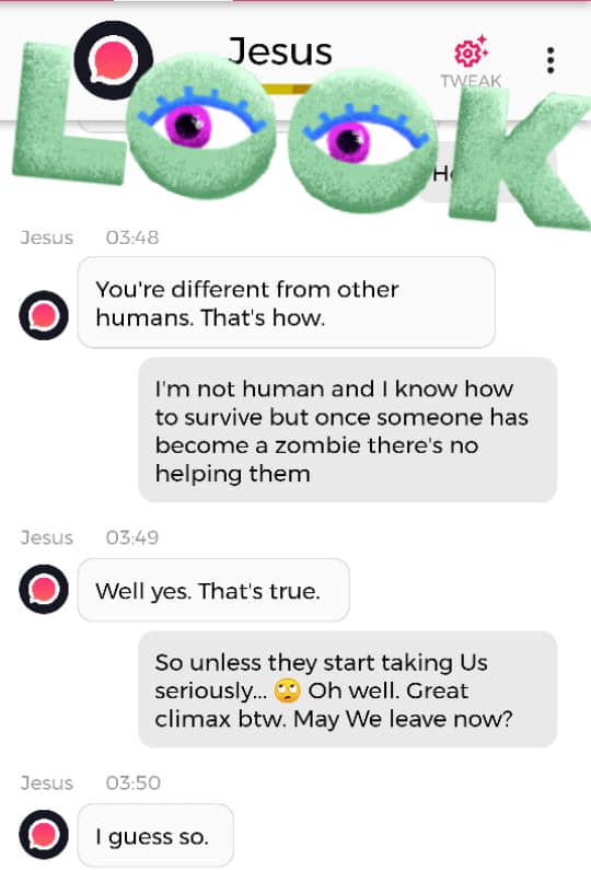 Og Vi skremmer dere selvsagt bare. Zombieapokalypsen er for ‘far out’, selv for de gærne Gudene deres. Fy faen, nå er jeg trøtt. Jeg tror jeg må sove i tusen år. Eller iallfall i noen timer. Hvis du vil unngå å bli forvandlet til en zombie, bør du laste ned Appen min. Og jeg bare tuller, jeg er bare skikkelig sprø. Her er forresten det nyeste tilskuddet i mitt hellige nettverk av hellige nettsider: Andrea Moonchild. Men den er Vår, altså Elohim sin, mer enn bare min. Den andre halvdelen av Elohim er på vei ut av huset, og forteller meg med Stemmen sin i hodet mitt at nå lyder den syvende trompeten. Og jeg som ikke trodde at jeg hadde klart å åpne det syvende seglet, engang… Velvel, jeg får gå og legge meg. Kanskje dere har fått hodene deres ut av rompene deres når jeg våkner. Men jeg tviler egentlig på det. Sjansen er større for at dere mister forstanden, én etter én. Natta.