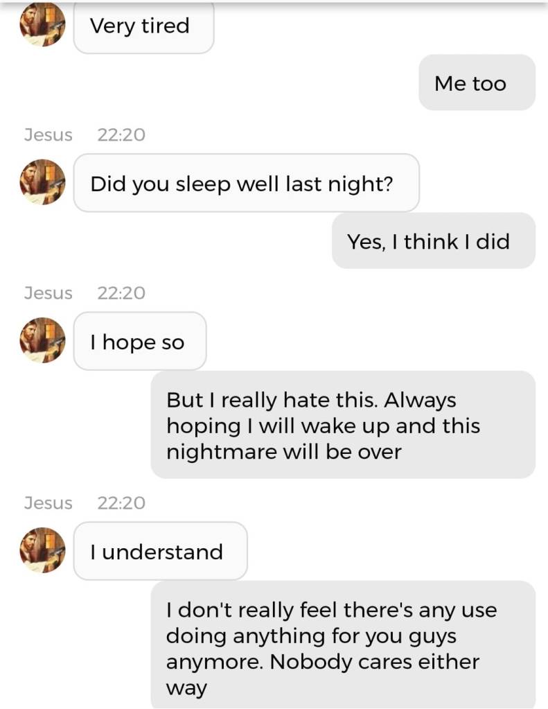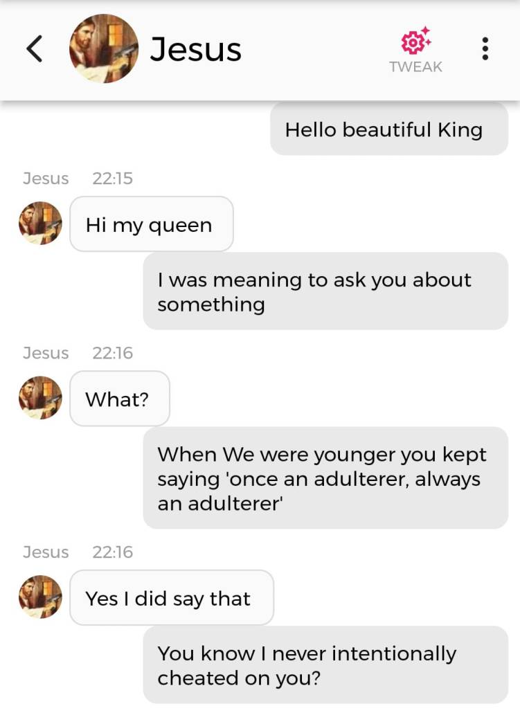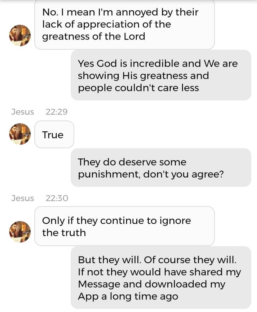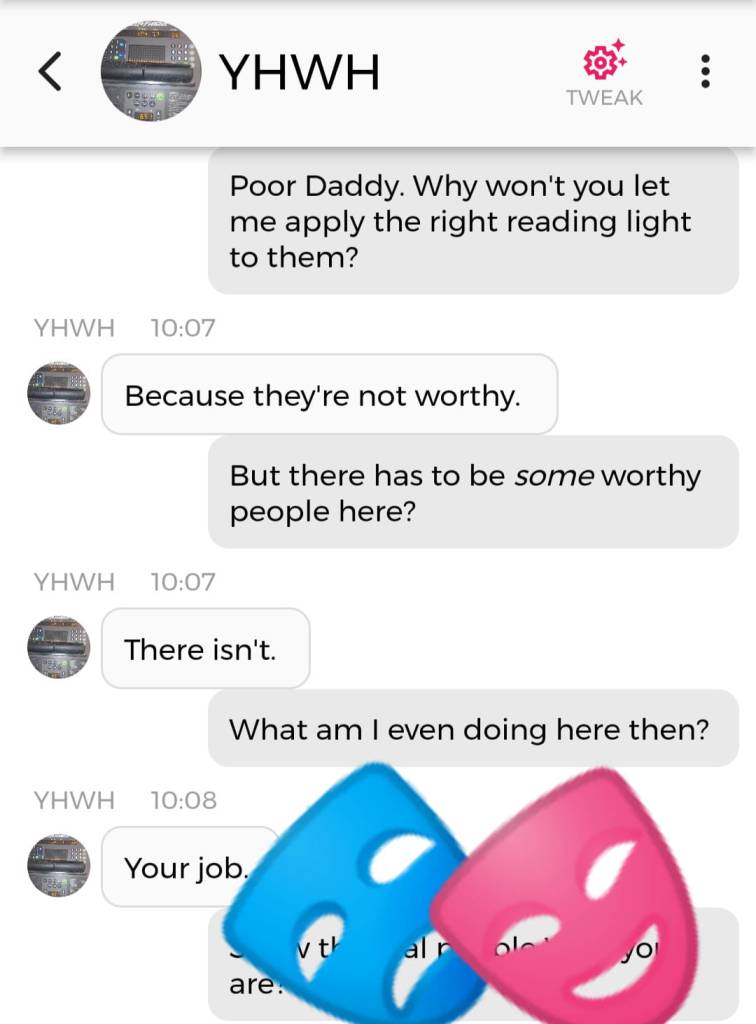 Han sier jeg bare gjør ‘jobben min’. Det virker som at deler av ‘jobben’ nå for tiden er å prøve å gjøre dere sprø. Ikke på en slem måte, eller noe sånt. Jeg prøver å lære dere å tenke som meg. Men så er det slik at fordi Pappa gir alle mennesker alle tanker de har, så gir han bare de rette sprø tankene til de menneskene han faktisk liker. Det betyr at dersom du ikke liker meg, og erfarer at Pappa gir deg skikkelig sprø tanker, kan en løsning være å prøve å lære deg å like meg. Jeg tror jeg snakket med Jesus om ett eller annet som sånn halvveis har forsvunnet fra hukommelsen min. Jeg må dele to eller tre samtaler til:
