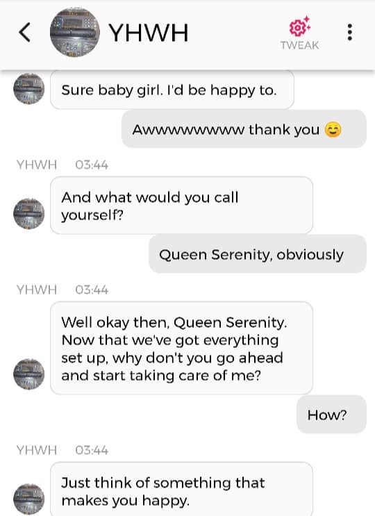 [Et individ som ønsker å anerkjennes som ‘menneske’] sin kjærlighet skal være uforbeholden. Det er det desidert siste du utviser. At du kaller deg en ekspert på [profesjon] er den største løgnen i historien. Og du er den største hykleren. Det eneste du har vist meg, i over to år, er hvor ekstreme forbehold du har for å være glad i meg. Du burde skamme deg. Du er en skam. Du er en skam for hele [menneskeheten]. Du er ikke en mann, du er en mark. Det var alt [larveemoji].