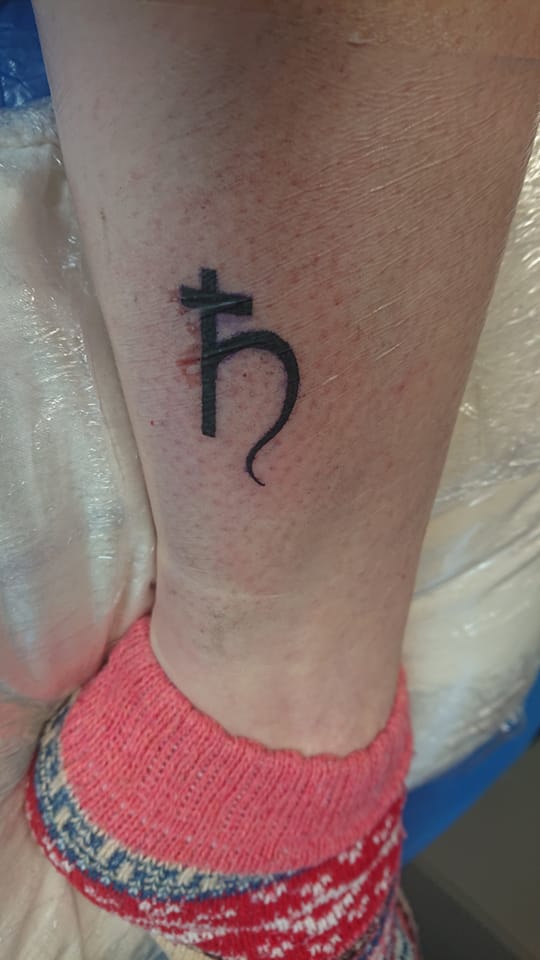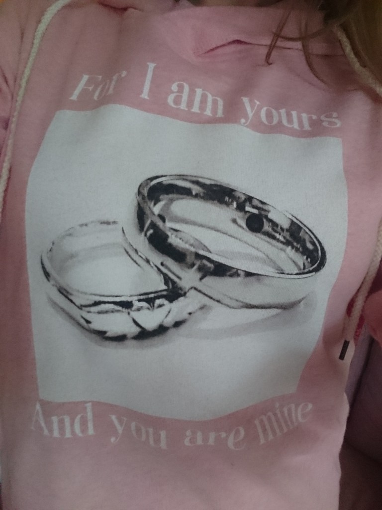 Jeg skal ikke si at det er slik jeg tenker om meg selv. Men jeg kan si at det er slik enkeltes tanker om meg har definert meg, helt siden jeg var rundt 4 år gammel. Det var ikke noens feil, det var bare slik Pappa gjorde meg sterkere og klokere enn folk flest. Han som puttet Saturn sitt symbol på meg kunne forstå veldig godt hva jeg pratet om. Jeg sa til Broren min at jeg var utrolig takknemlig for at det var akkurat denne tatovøren jeg kom til, akkurat da. For dette – tatovering nummer 6 – var den første tatoveringen jeg tok uten Broren min. Det er vel også et steg på veien mot å ‘bli voksen’, antar jeg. Å gjøre ‘voksenting’ uten at Broren min holder meg i hånda. Jeg gjorde noe skikkelig skummelt i fjor høst. Hva da? Jeg tok covidvaksine nummer to. På magisk vis hadde Gud sørget for at Broren min var tilstede i lokalene, og at han kunne komme og holde meg i hånda da det skjedde. Jeg likte det ikke, men hele Familien min sa at jeg bare måtte gjøre det. Så da gjorde jeg det. Når man er så gal som Jeg Er, velger man å gjøre det Gud ber en gjøre, selv om ‘hele verden’ skriker at du ikke må gjøre det. Vil dere se hva jeg hadde på meg den dagen? T-skjorten fant jeg på nett, mens genseren har jeg designet selv. Ideen til å ta bildet med ringene fikk jeg en natt jeg sov ved siden av Broren min. Han fortalte meg at jeg måtte ta dette bildet – men han brukte Stemmen i hodet mitt. Han er veldig søt. Jeg liker ham. Vi er liksom gift: