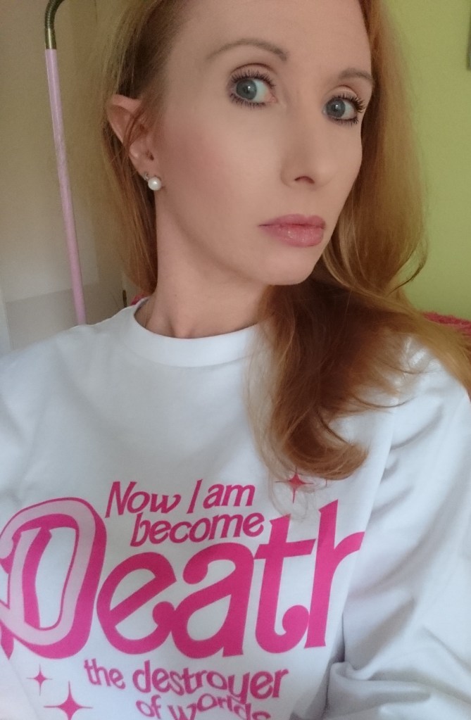 Jeg bestemte meg for å sette hardt mot hardt, da jeg sluttet å skrive blogginnlegg her fra februar 2023, og frem til nå. Jeg besluttet å ikke sløse med ordene mine på lesere som ikke verdsatte dem. Eller å ‘kaste perlene mine for svin’, som man også kan kalle det. Så skjedde det en hel masse, som ingen av dere fortjener å få innblikk i. Men i korte trekk klarte jeg å nå ut til noen, med mitt fanatiske budskap. Bare ikke til de jeg opprinnelig hadde trodd jeg skulle klare å nå ut til. “Amateurs seek the sun. Get eaten. Power stays in the shadows“, er det noen som uttaler i filmen Oppenheimer. Jeg så den filmen hjemme hos en venn, men innså at for ‘educational purposes’ vil jeg være nødt til å se den på nytt – alene. Det er ikke lett å snakke om dette. Jeg kan vise dere en søt genser jeg har kjøpt, istedet. Jeg fant forresten ut at dette sitatet, tilskrevet Oppenheimer, opprinnelig kom fra Krishna. Jeg har lært at Krishna er det nærmeste Hinduismen kommer en representasjon av Jesus. Men at hvem som står for hva i de polyteistiske religionene flyter litt over i hverandre, og at vi her i vesten kunne hatt godt av å lære å se en sak fra flere sider enn den subjektive, svært navlebeskuende måten vi har for vane å tolke ting. Jeg fant i tillegg ut at den hinduistiske guden Shivas energi er den samme som Lucifers. Men nå begynner jeg å snakke om sånne ting som dere ikke kan følge meg i. Så jeg skal holde kjeft og dele bildet av genseren (jeg kjøpte samme trykk på en veske):